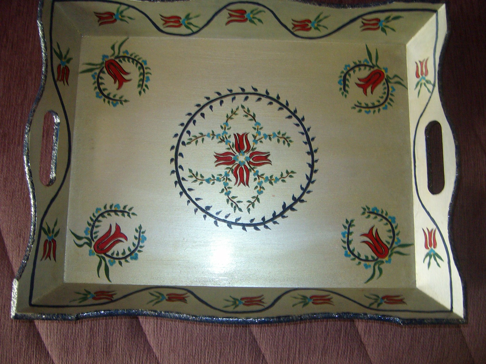 Ahşap boyama denemelerimden,orta boy bir tepsi.Sedef boya üzerine sıfır numara fırça ile düz boyama yaptım.Kuruduktan sonra vernikledim. Ha bu arada desen tasarımı bana ait.Yeni yayınlarda buluşmak üzere...